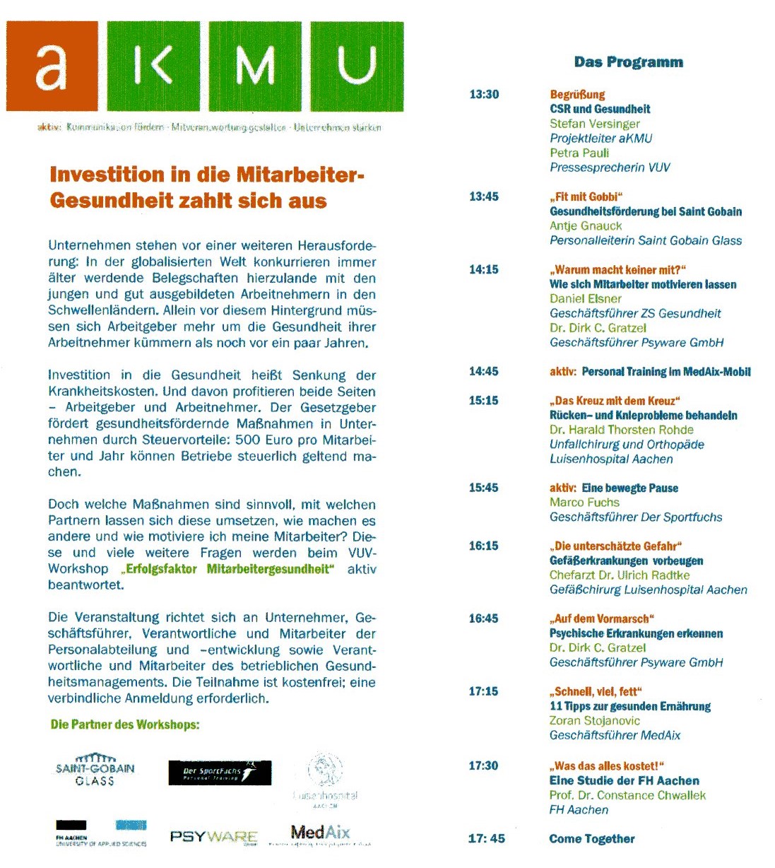 Aachener-Unternehmer-Verband Geschrieben von marco am 24. November 2014. „Workshop Erfolgsfaktor Mitarbeitergesundheit“. Zurück Weiter